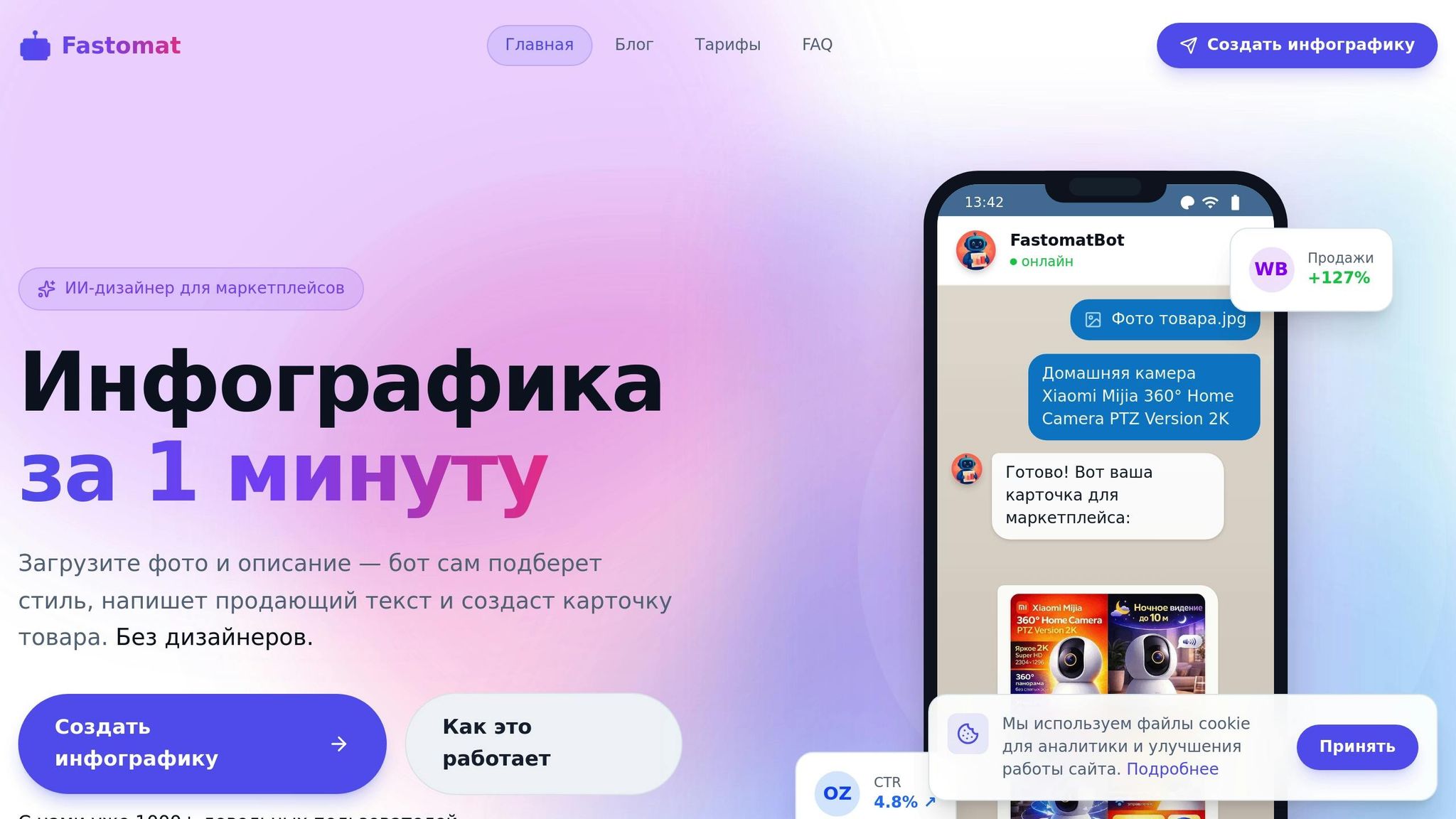 Fastomat Bot - это инструмент, который буквально переворачивает представление о создании карточек товаров для маркетплейсов Wildberries и Ozon. С его помощью можно за секунды получить профессионально оформленные карточки. Достаточно загрузить фото и описание продукта, а бот автоматически создаст инфографику с оптимизированным текстом и дизайном. Все работает через Telegram, без регистрации, а права на созданные изображения остаются у пользователя.