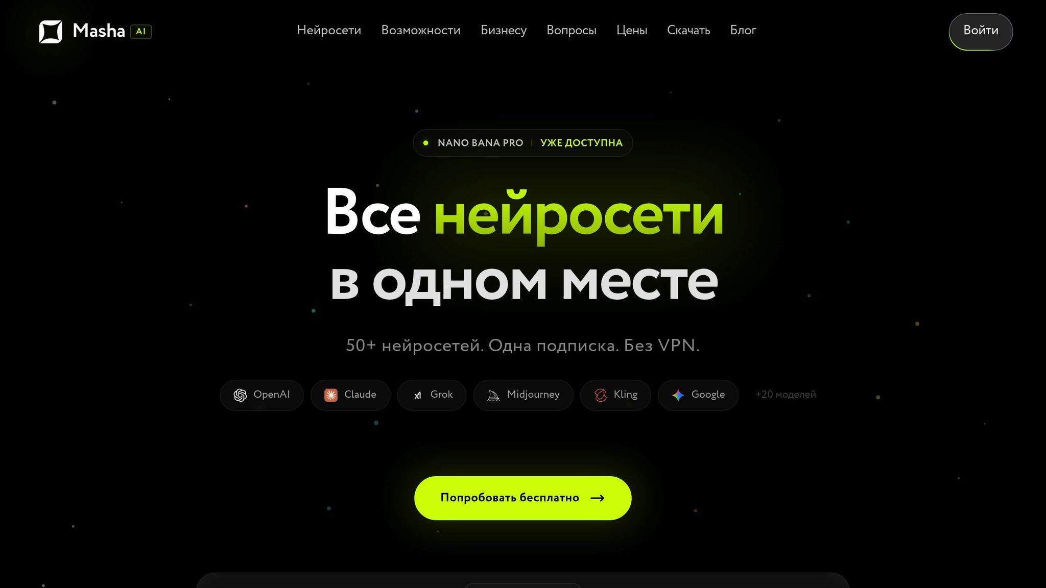 | MashaGPT | Информация отсутствует | Информация отсутствует | Генерация текстов и описаний | Работа с различными AI-моделями |