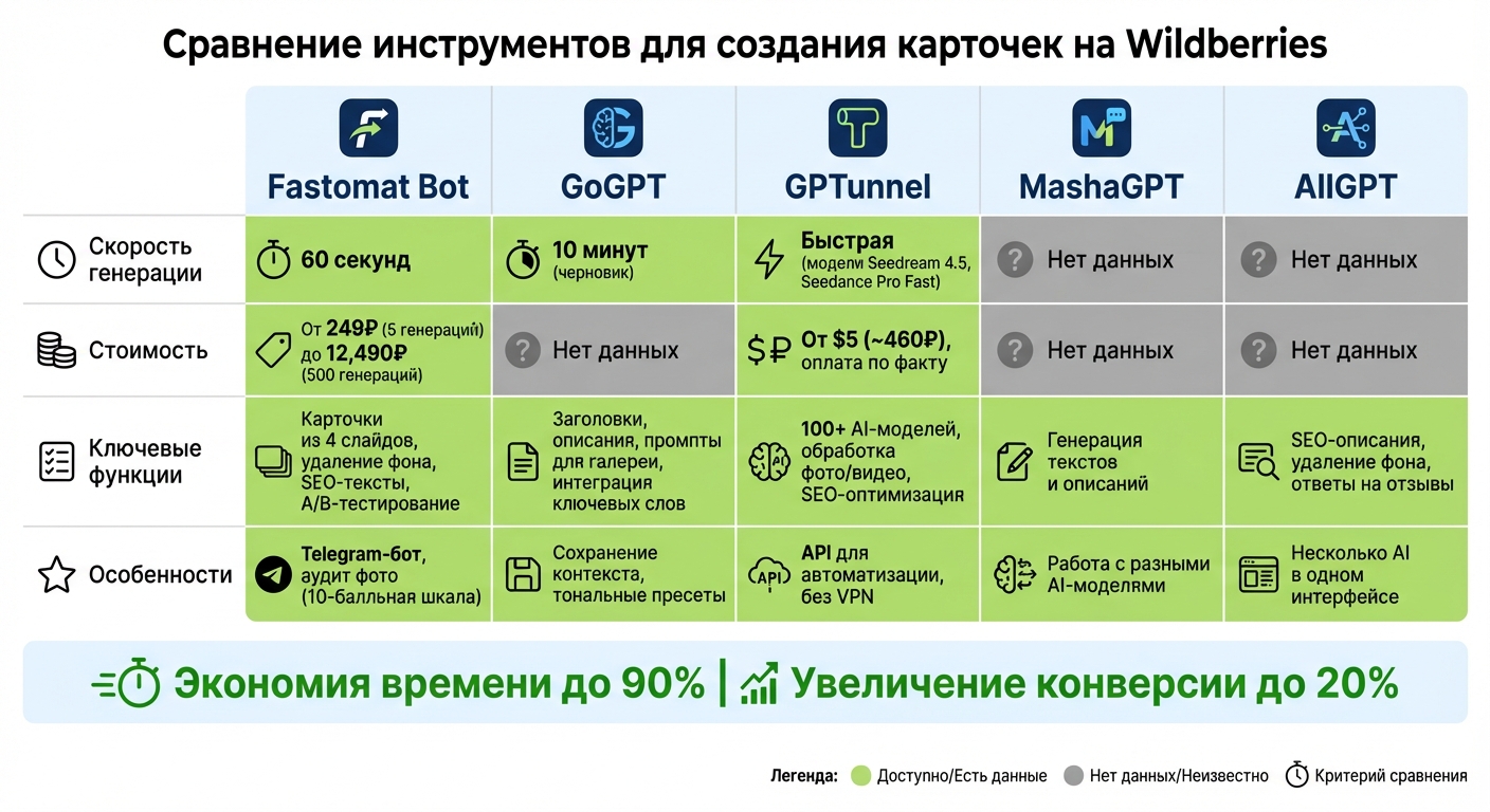 Создание карточек товаров для Wildberries больше не требует долгих часов работы дизайнера или глубоких знаний в области SEO. Современные AI-инструменты позволяют сократить время на создание карточек до 90%, а их обновление - до 80%. Это освобождает время для продавцов, чтобы сосредоточиться на развитии бизнеса. Например, Fastomat Bot генерирует инфографику и готовые карточки за считанные минуты, а такие сервисы, как GoGPT, GPTunnel, MashaGPT и AllGPT, предоставляют дополнительные функции для работы с текстами и визуальными материалами, включая создание описаний, оптимизированных для поисковых систем.